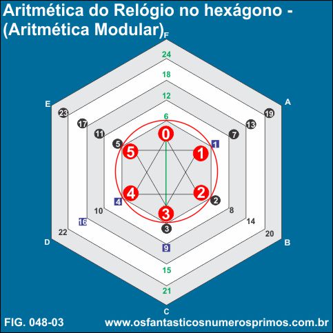 Partindo-se do "marcador 0" e girando em sentido horário tantos vértices que se queira, ao pararmos em determinado número e dividirmos esse número por 6, os possíveis restos podem ser: 0, 1, 2, 3, 4 ou 5.
